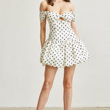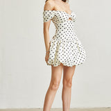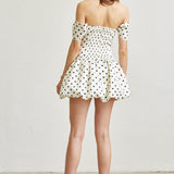 Turn heads in this ultra-feminine off-shoulder satin dress, crafted in a playful polkadot print. Designed with a twist-front bust and built-in bra cups for support and style, this dress features a flirty cutout midriff and a voluminous bubble skirt for a bold silhouette. The smocked back with zipper closure ensures a secure yet flexible fit. Perfect for parties, date nights, or special occasions.