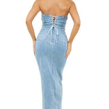 Fashion denim strapless dress, back strap up and invisible zipper, stretch fabric, body-con style