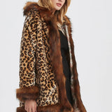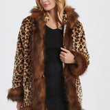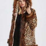 Womens Leopard Print Hooded Faux Fur Collar Jacket
